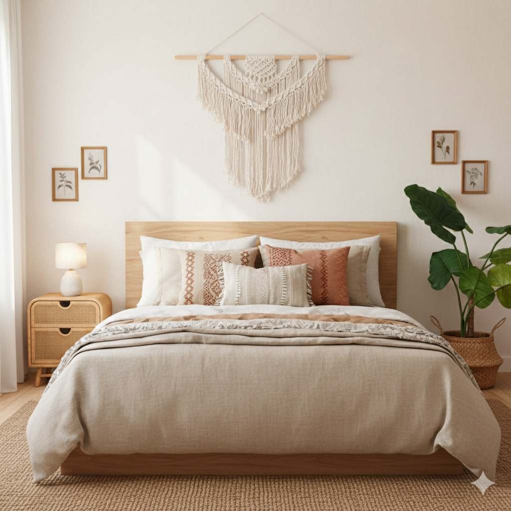 Calidez Orgánica: La madera natural y el algodón crudo crean un contraste acogedor que eleva la energía de tu habitación o salón.
